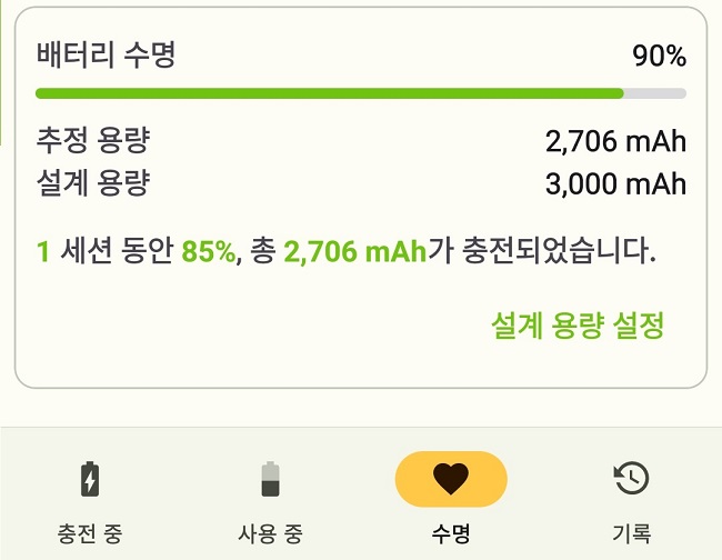 다만, 이 경우 5% 이상을 충전했을 때 표시를 해주는데요. 충전이 끝난 다음 해당 앱을 실행해서 하단 좌측의 "충전 중" 탭을 터치하면 아래처럼 설계 용량과 추정 용량을 표시해줍니다. 만약 설계 용량이 표시되지 않으면 수동으로 설계 용량 설정을 해줘야하는 점 유의하세요.(대개 자동으로 설계 용량을 인식함)